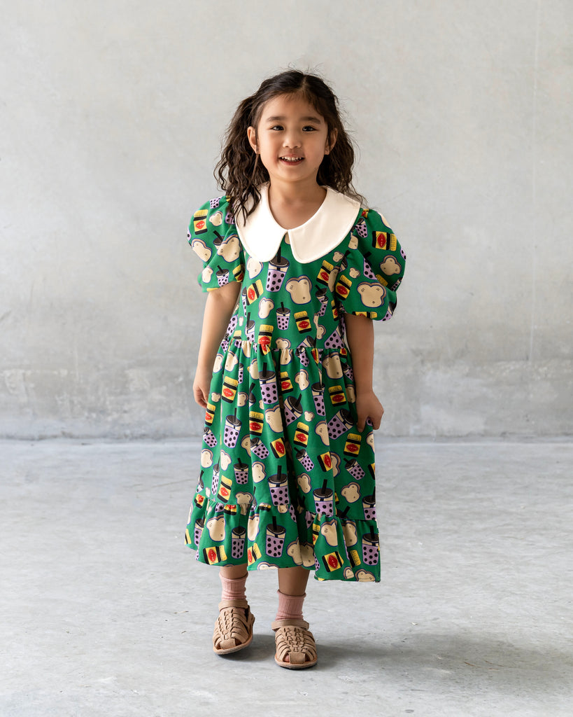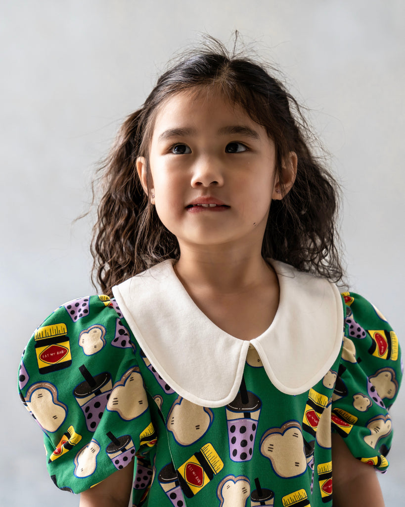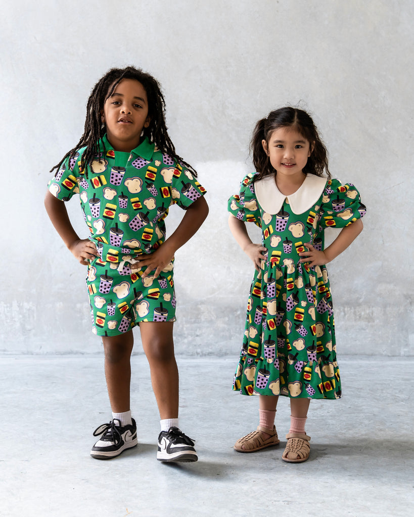 Featuring an eye-catching print of boba tea and Marmite sandwiches, it’s a fun celebration of both Asian and Australian cultures. The bold combination of bright green and gold adds a splash of vibrant colour, creating a look that's as lively and adventurous as your child.